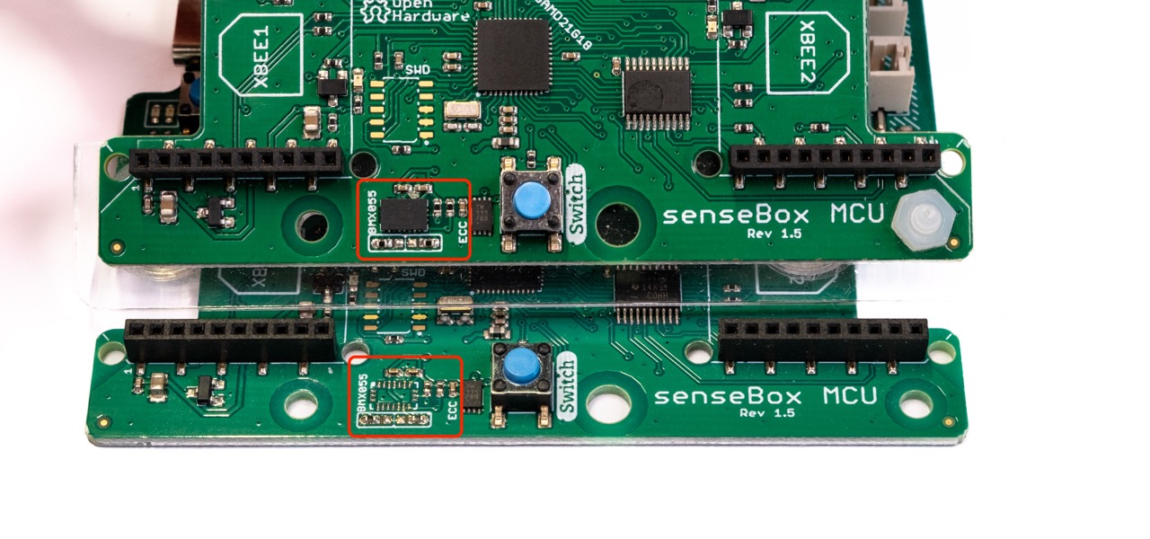 Aufgrund der Knappheit von Elekronikbauteilen wurde eine Charge der Revision 1.5 ohne Beschleunigungssensor (BMX055) ausgeliefert. Falls du dir unsicher bist ob deine senseBox MCU eine Beschleunigungssensor hat, hilft dir die untstehende Grafik weiter. Die obere Version der MCU V1.5 hat einen Beschleunigungssensor, die untere Version nicht.