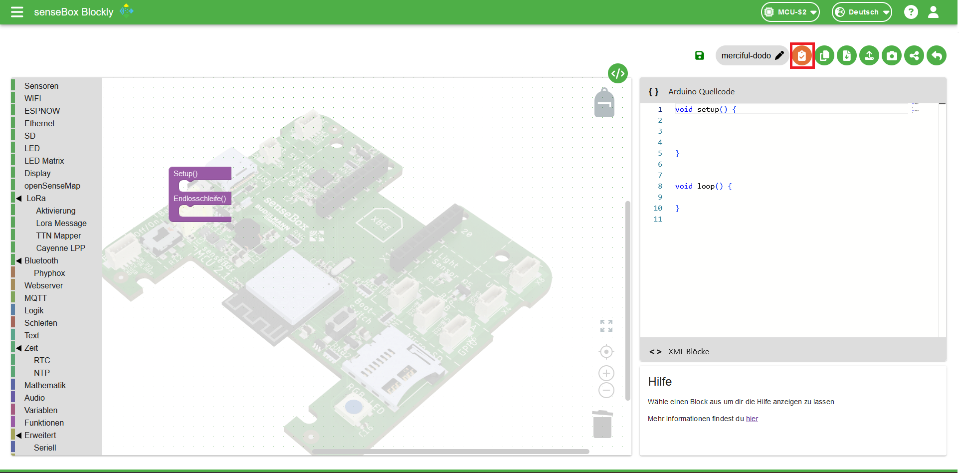 Um deinen Sketch kompilieren zu lassen, klicke in Blockly oben rechts auf den orangenen Knopf mit dem Notizblocksymbol.