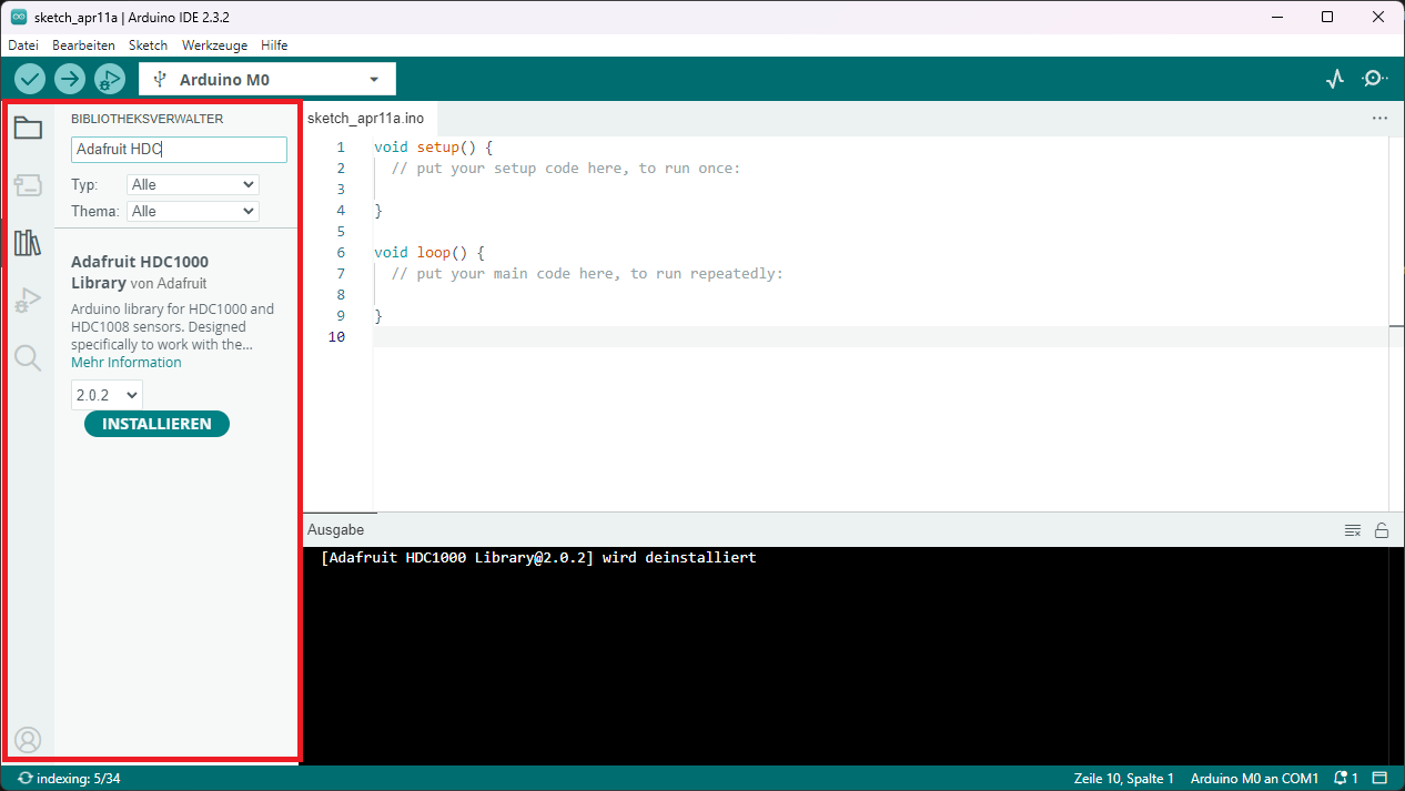 Wähle die Library aus und klicke auf Installieren. Die IDE lädt die gewählte Library herunter und fügt sie zu deinen verfügbaren Libraries hinzu.