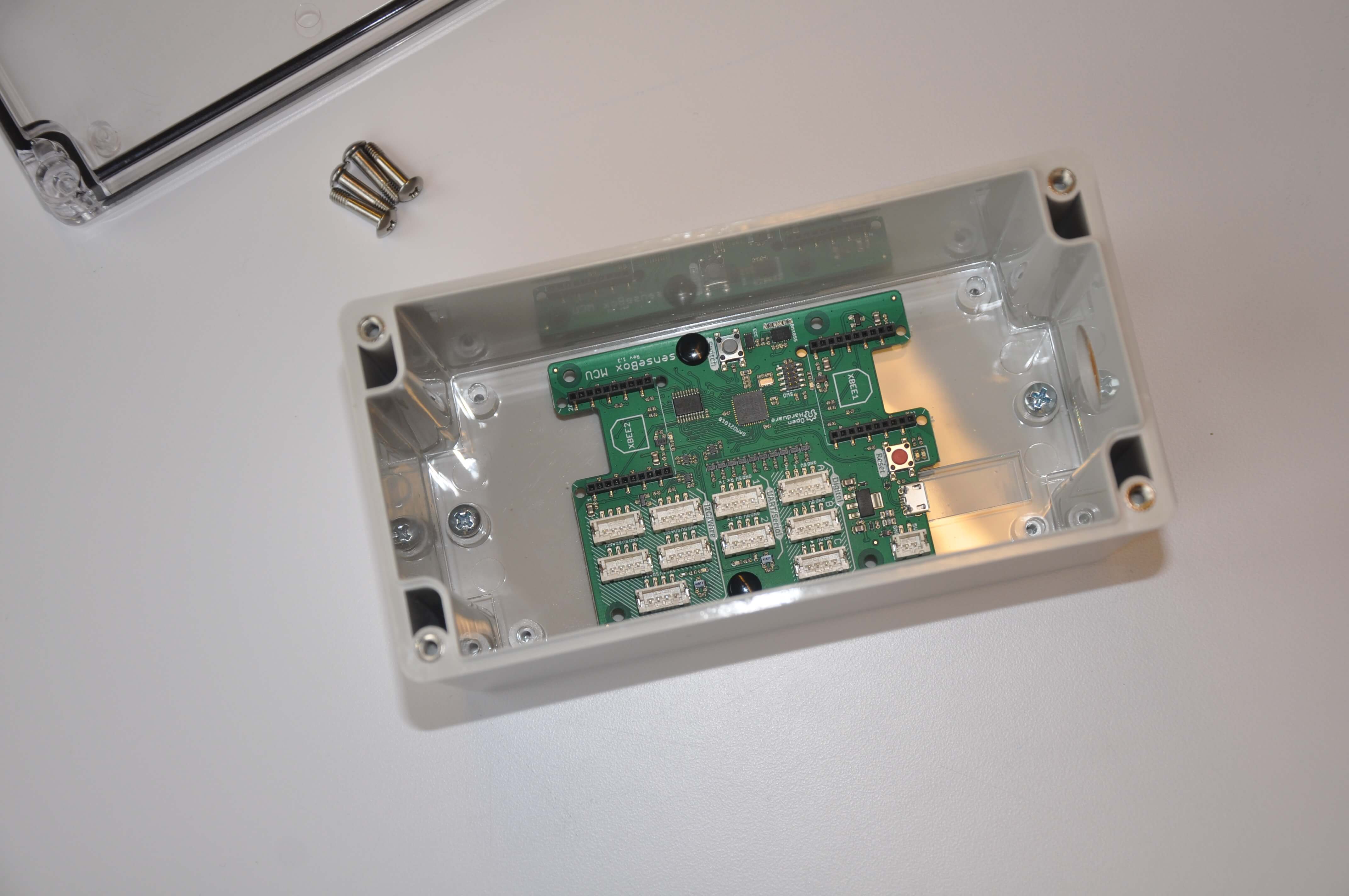 Nun schraubst du die Acryllplatte in das Gehäuse fest. Achte darauf, dass die Öffnung für den USB-Anschluss zur Öffnung des Gehäuses zeigt. Danach kannst du mit den schwarzen Schrauben die senseBox MCU auf die Acryllplatte befestigen. Hier muss wieder darauf geachtet werden, dass der USB-Anschluss zur Öffnung des Gehäuses ausgerichtet ist.