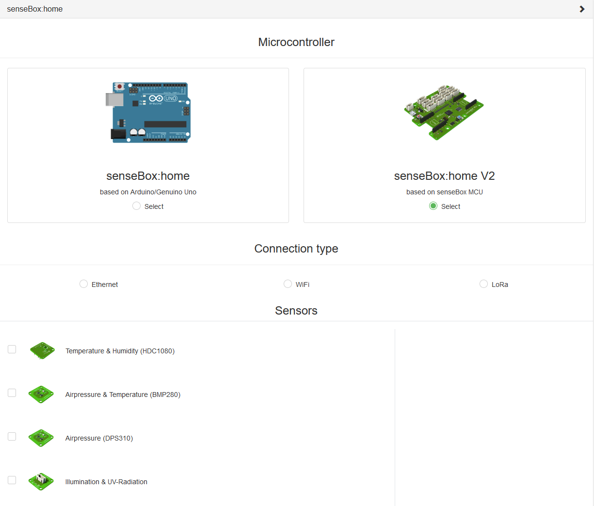 Since openSenseMap is open to all types of senseBoxes, you will be asked about the hardware you are using. Select senseBox:home V2 and the data transmission module you are using. If you want to send your data to openSenseMap via LoRa, select LoRa as the "Connection type". Then you can enter your LoRa settings in the "Advanced" tab. Here you need to enter the Application ID and Device ID that you specified on TheThingsNetwork. More information can be found here.